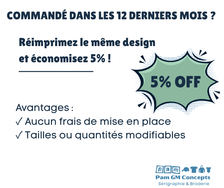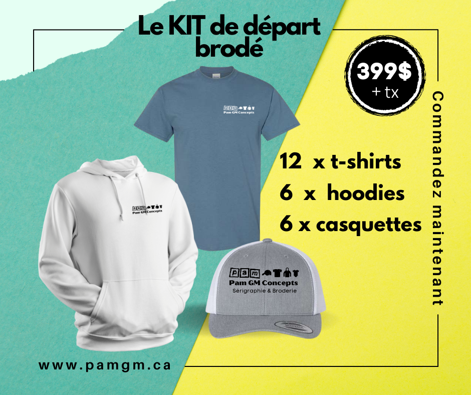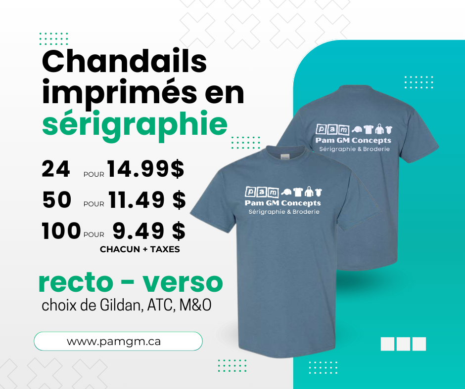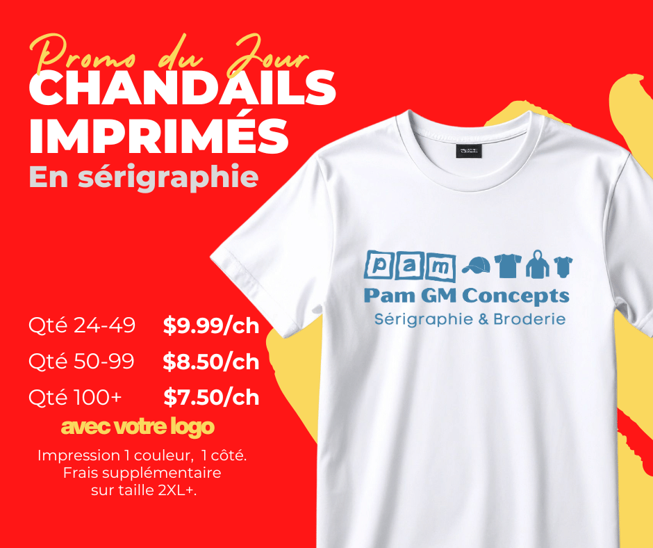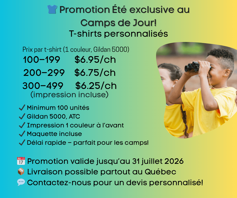 Prêt à commander ? Contactez-nous pour un devis rapide ! Promo du Jour - t-shirts Le recto-verso le Kit brodé un côté Promotion camps de Jours OFFRE RÉIMPRESSION – 5% DE RÉDUCTION Offre pour votre équipe Demander une soumission
